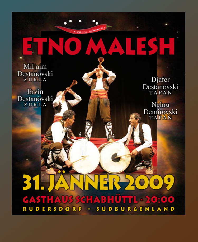 Etno Malesh Samstag den 31. Jänner 2009; Beginn 20.00 UhrGasthaus Schabhüttl in A-7571 Rudersdorf / Hauptstraße Eintritt: 13,- | Jugendliche: 4,- | Mitglieder 10,-