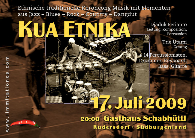 Eine Sensation bei Limmitationes: die Nummer eins in Indonesien, Kua Etnika - eine Band bestehend aus 16 MusikerInnen !!! - zu Gast in Rudersdorf.; Gamelan Musik, Traditionelles, aber auch sehr sehr grooviges und viel Show; mit ihrem Stargast, der berühmtesten Jazzsängerin Indonesiens : Trie Utami; und vorallem : Indonesisches Essen. Am besten ins Internet gehen und hören und sehen: groovig: www.youtube.com/watch?v=1h5dcjRIQ-E traditionell: www.youtube.com/watch?v=82a2H_t8tJc traditionell: www.youtube.com/watch?v=MowO_pz9UFc jazzig: www.youtube.com/watch?v=aM-Rc9t5rq8