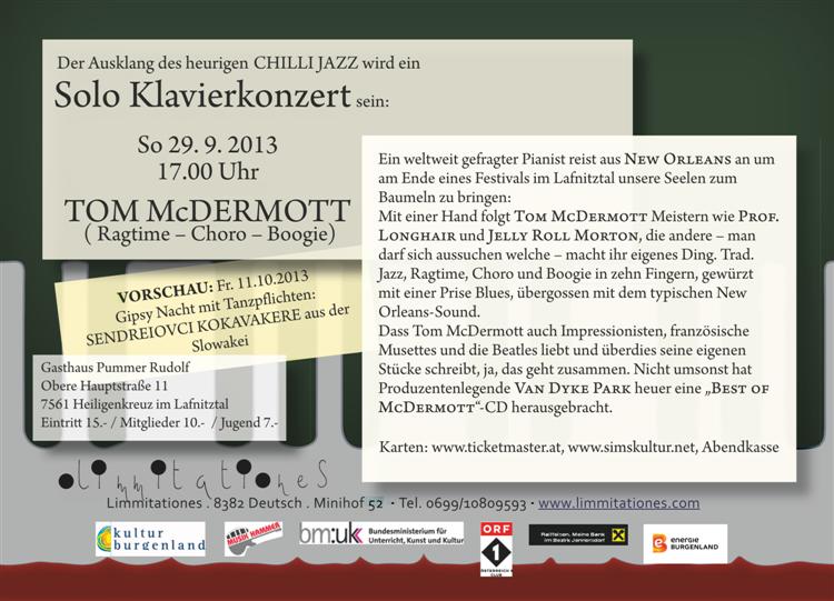 DER New Orleans Pianist Tom Mc Dermott beschließt das Festival der befreienden Musik mit Ragtime, brasilianischer Choromusik und Swing auf einem hier noch selten gehörten Niveau.